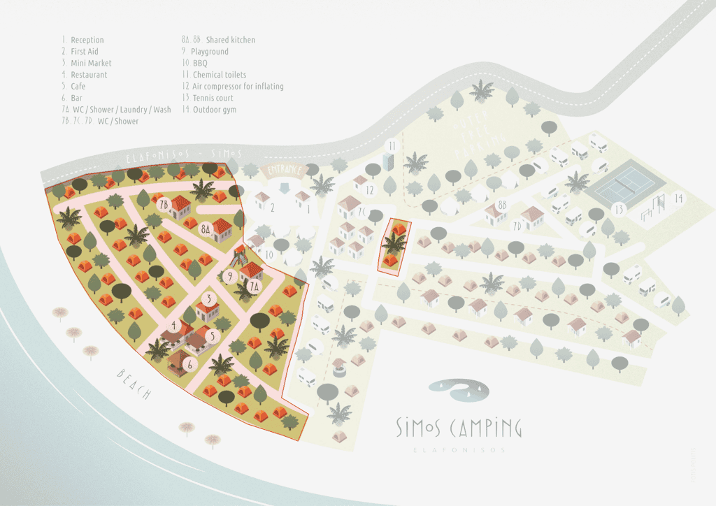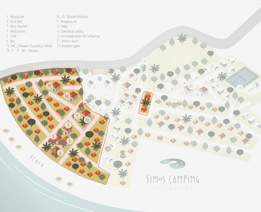 The camping spots in Area B1 can accommodate up to two tents for four people each or one large tent up to 5 meters and have an average height of 1.85 meters. They are equipped with a wooden shade structure for optimal sun protection and are separated by trees and vegetation, offering natural privacy. The ground is covered with gravel, ensuring stability for the tent and camping equipment. Each spot has access to an electricity supply, while a designated parking space for the car is available in front of the tent area.
