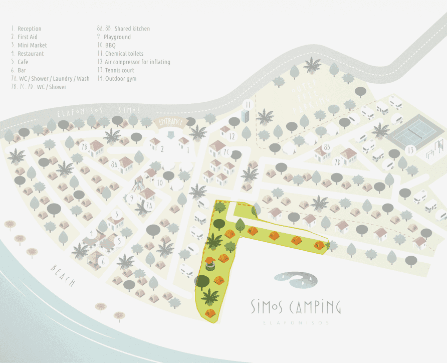 The camping spots in Area B3 can accommodate up to two tents for four people each or one large tent up to 5 meters, placed one in front of the other, and have an average height of 2 meters. They are equipped with a fabric shade structure for effective sun protection and are arranged next to each other, with tents located on either side, as there is no natural separation with trees or vegetation. The ground is covered with gravel, ensuring stability for the tent and camping equipment. Each spot has access to an electricity supply, while the car can be parked near the tent area.
