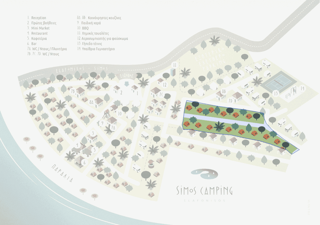 - Τύπος διαμονής: 1 Μεγάλη Σκηνή μέχρι 5μ, 2 Σκηνές των 4 ατόμων